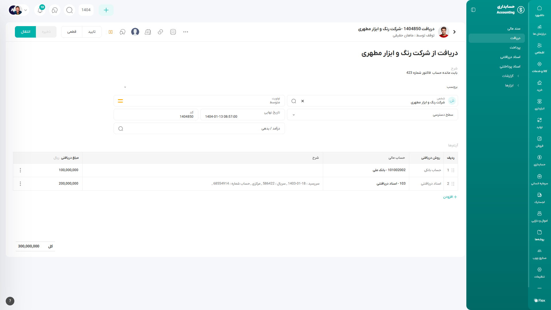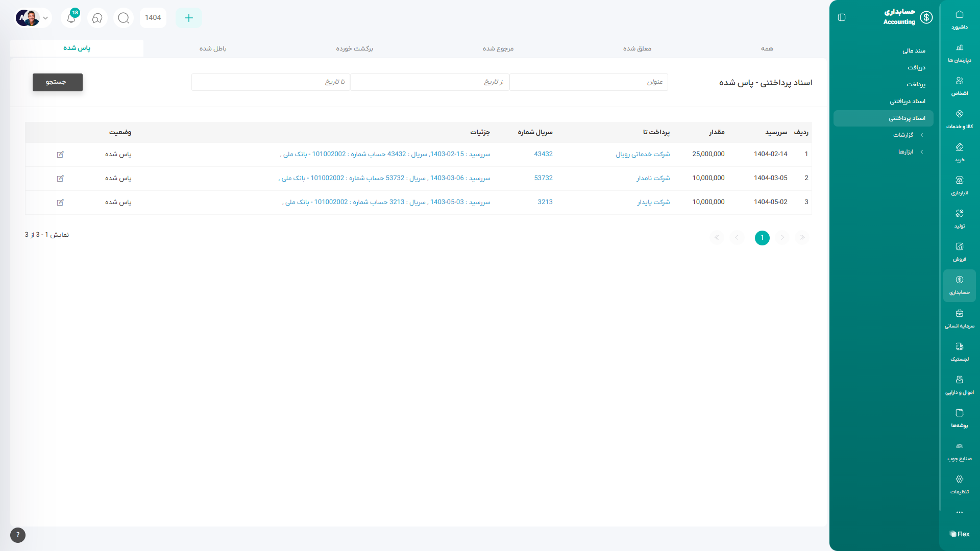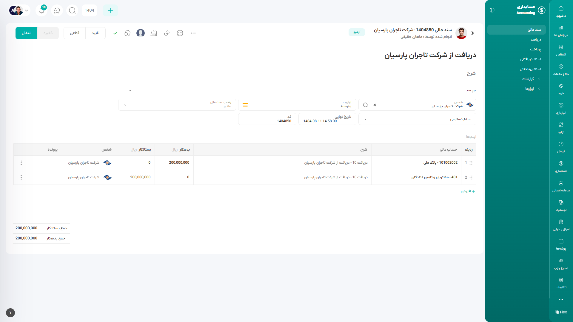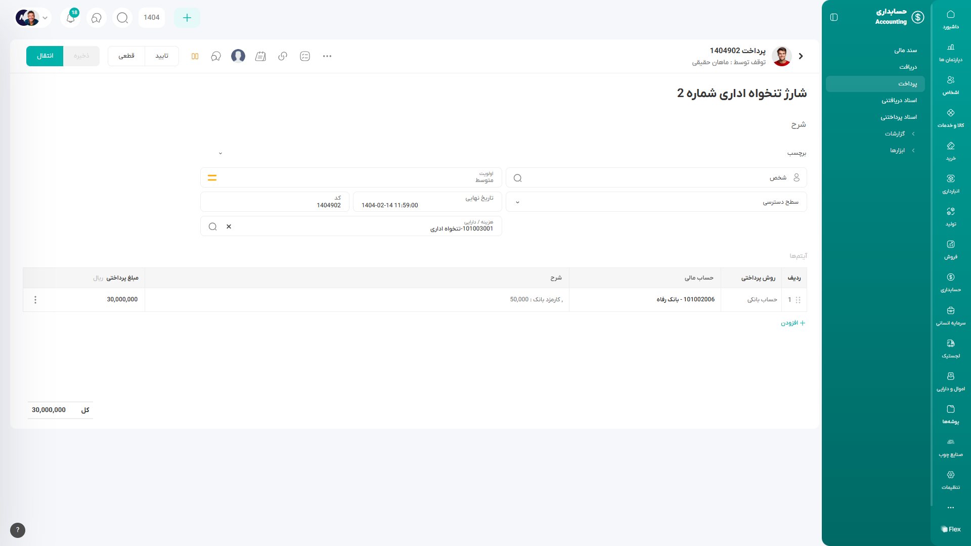 با ثبت این سابماژول، یک سند مالی همگامشده نیز بهصورت خودکار در سیستم ایجاد میگردد که اطلاعات حسابداری مربوط به پرداخت را ثبت و مستند میسازد.
