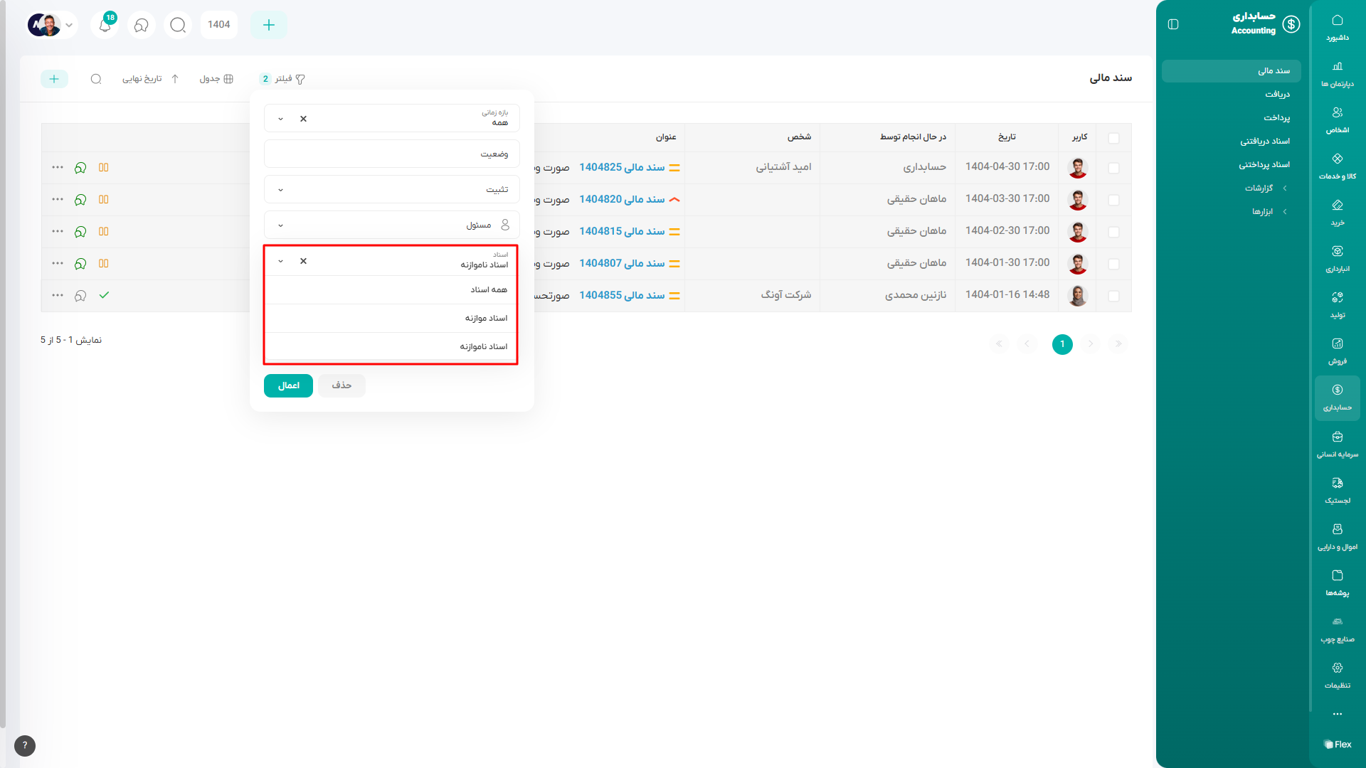 در فیلتر لیست اسناد مالی، یک فیلد به نام موازنه وجود دارد. در صورتی که جمع بدهکار و بستانکار اسناد مالی با هم برابر باشد، این اسناد در بخش اسناد موازنه قرار میگیرند. در صورتی که جمع این دو برابر نباشد، اسناد در بخش اسناد ناموازنه قرار میگیرند.