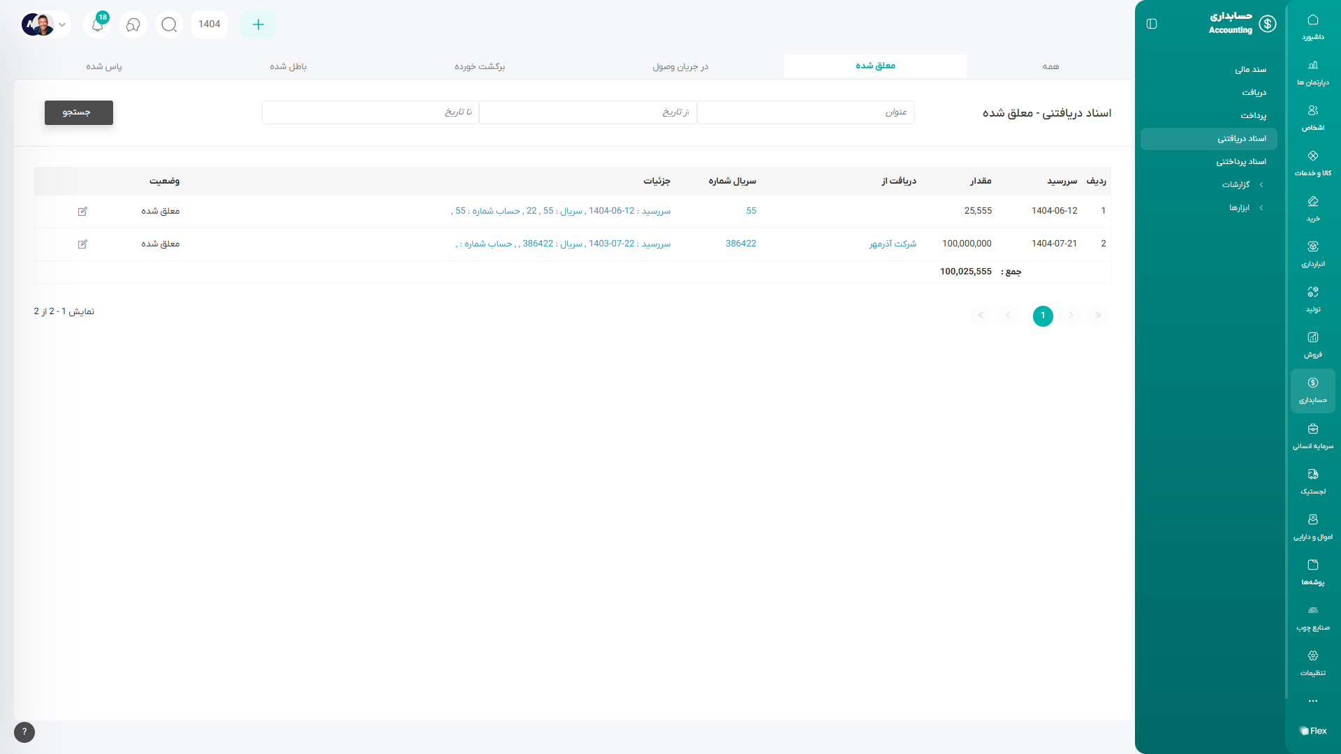 با تغییر وضعیت هر چک (مانند: پرداختشده، ابطال، برگشت و...)، یک سند مالی همگامشده در سیستم ایجاد یا بهروزرسانی میشود که اطلاعات حسابداری مربوط به آن تراکنش را ثبت مینماید.
