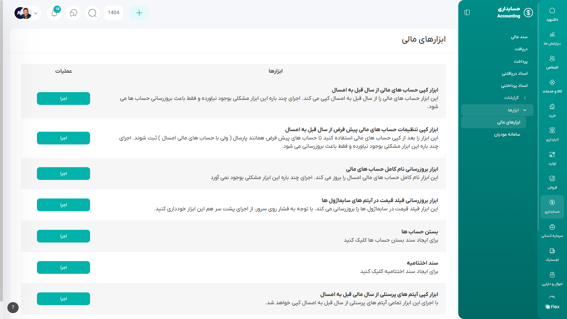بخش ابزارهای مالی شامل مجموعهای از ابزارها است که برای مدیریت حسابها و تنظیمات مالی در ابتدای سال مالی، انتهای سال مالی یا به صورت فصلی استفاده میشود. این ابزارها معمولاً در هنگام تغییر سال مالی و نیاز به بهروزرسانی حسابها برای شروع سال جدید به کار میروند.