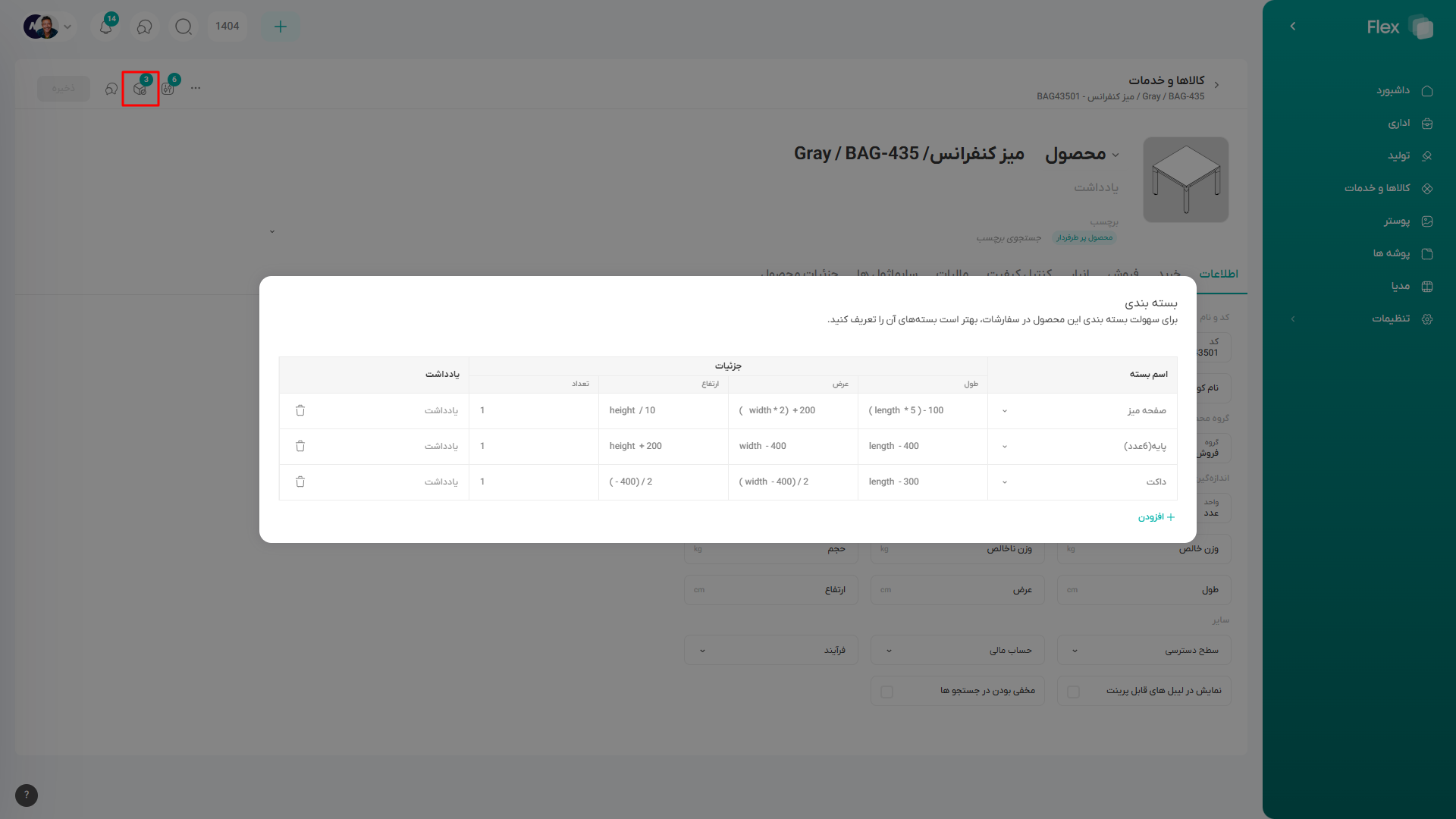 بستهبندی: لیست بستهبندیها بر اساس تنظیمات بخش مدیریت بستهبندی که در نوار ابزار بالای صفحه قرار دارد، نمایش داده میشود.