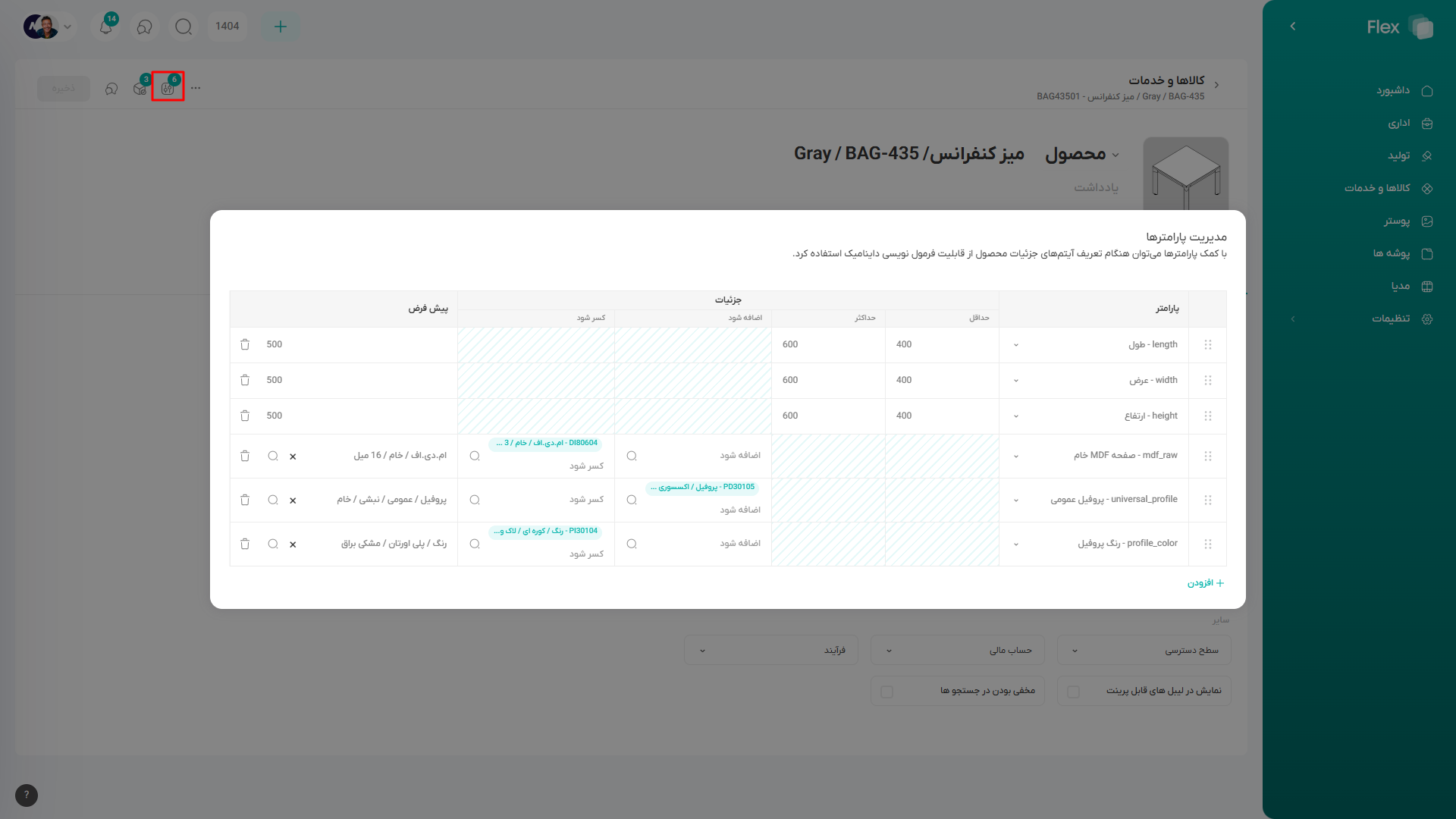پارامترهای کالایی یکی از قابلیتهای پیشرفته در سیستم مدیریت «جزئیات محصول» است که امکان تعریف پویا و متغیر برای آیتمهای مصرفی در ساختار محصول را فراهم میکند.