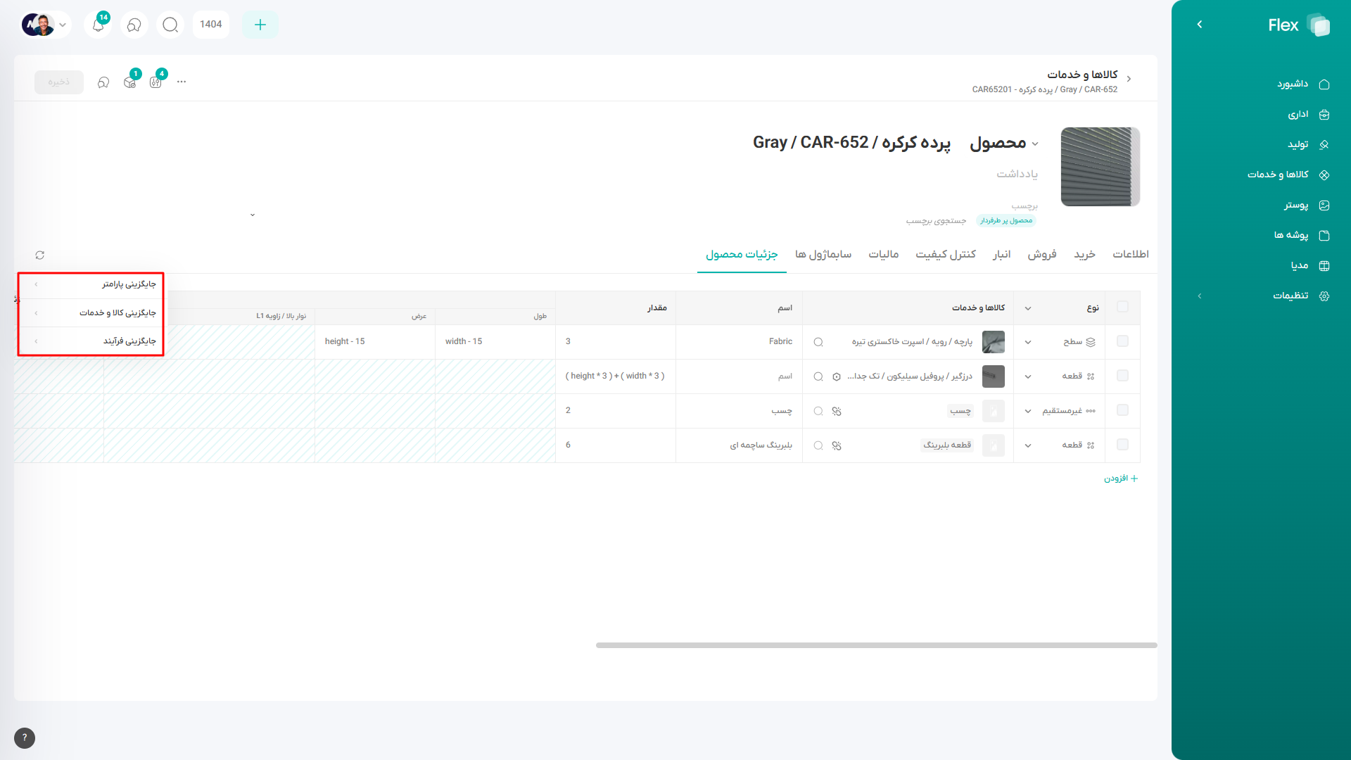 در بخش «جزئیات محصول»، استفاده از پارامترهای عددی این امکان را فراهم میکند که مقادیر فیلدهایی مانند طول، عرض، مقدار و نوارها بهصورت پویا و وابسته به متغیرهای محصول تعریف شوند. این قابلیت برای محصولاتی که در ابعاد یا شرایط مختلف تولید میشوند بسیار مفید است و به شما اجازه میدهد تنها یکبار ساختار محصول را تعریف کرده و در هر سفارش، مقادیر متناسب با نیاز مشتری تنظیم شوند.