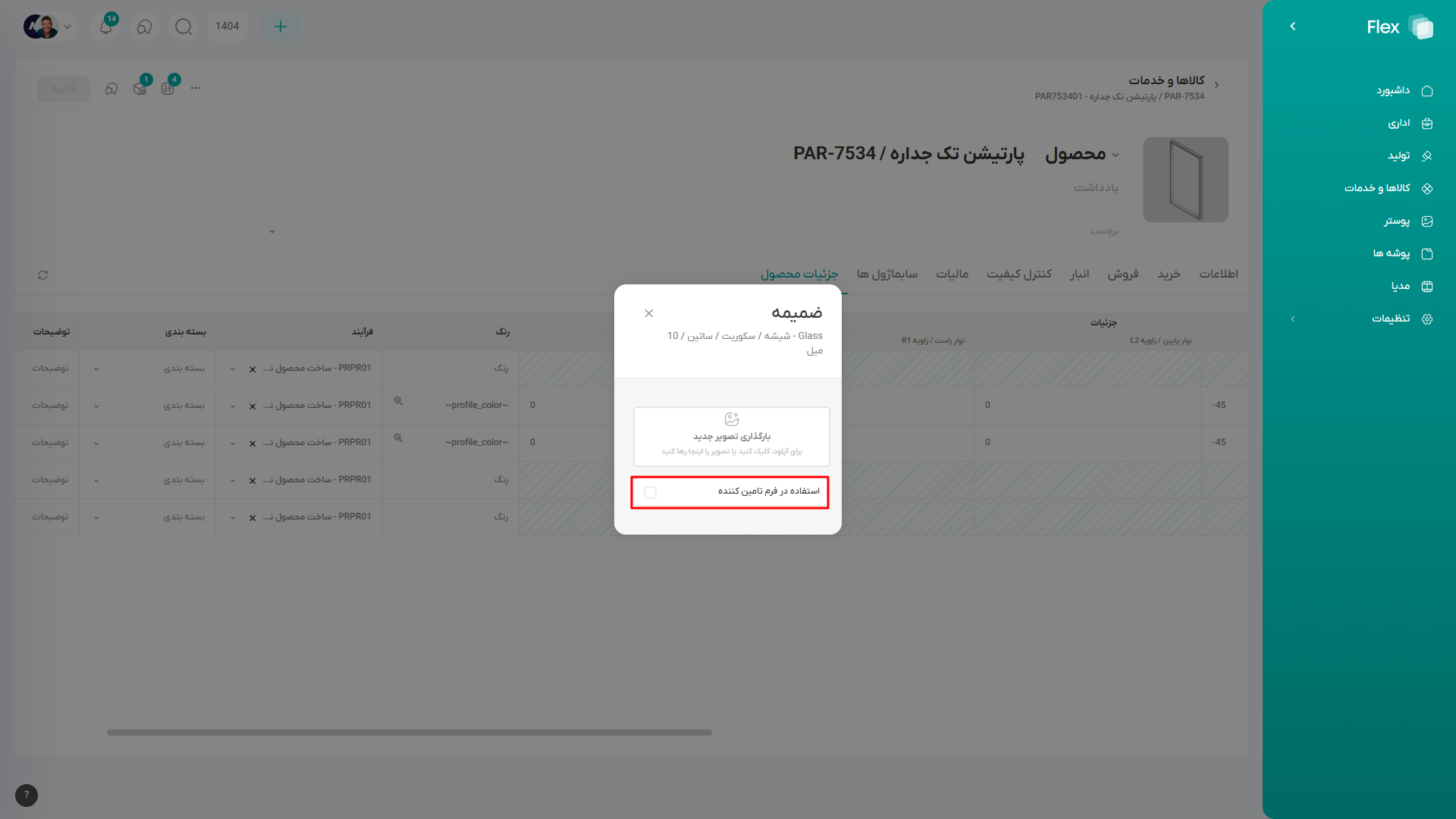 اگر نوع آیتم در ردیف، سطح باشد، در انتهای همان ردیف در بخش مدیریت فایلها، یک آیکون به نام استفاده در فرم تامینکننده نمایش داده میشود. با انتخاب این گزینه، تصویر مربوطه به فرم تامینکننده برای نقشهای مرتبط با برش شیشه یا پردهها منتقل میشود.