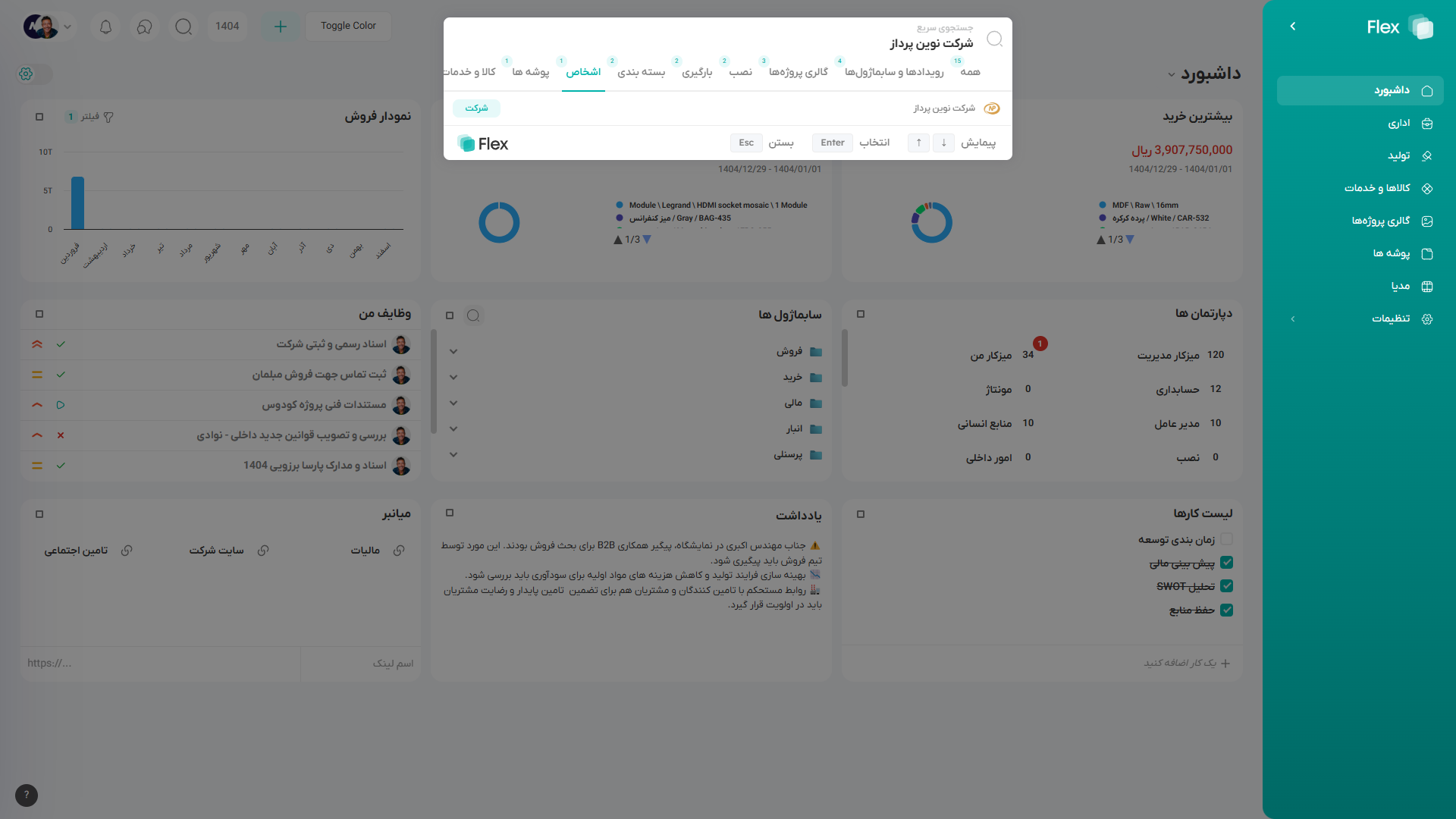 برای مثال، با وارد کردن عبارتی مانند "شرکت نوین پرداز"، سیستم نتایج مرتبط را از بخش اشخاص پیدا کرده وبا کلیک روی آن ردیف اطلاعات شخص مورد نظر نمایش داده میشود.