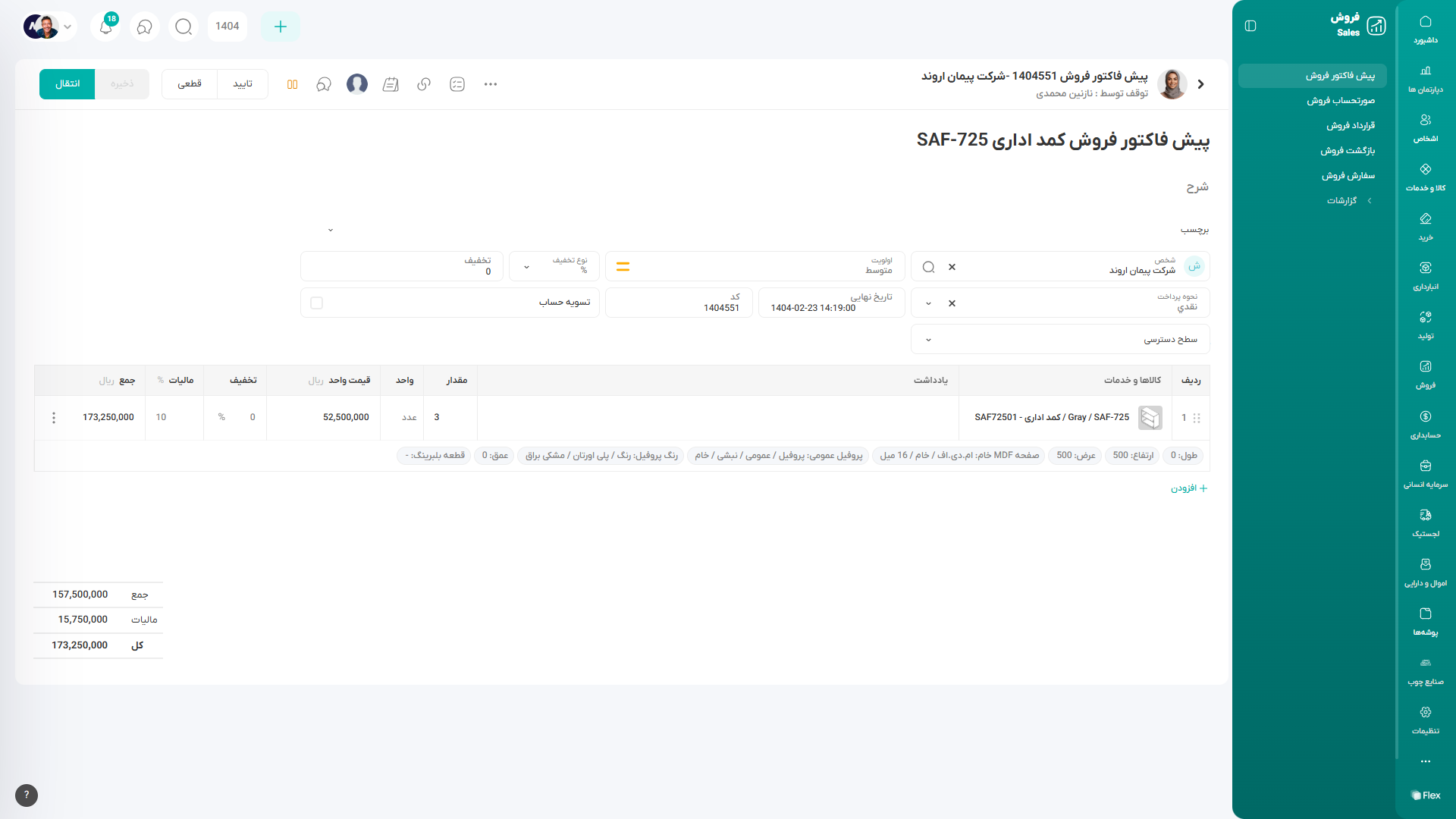 سابماژولهای فروش برای مدیریت فرآیندهای مرتبط با فروش کالاها و خدمات به کار گرفته میشوند. این سابماژولها به کاربران امکان میدهند تا کلیه مراحل فروش ثبت پیشفاکتور و دریافت سفارش تا صدور صورتحساب و ثبت بازگشت کالا را بهصورت ساختارمند و قابل پیگیری در سیستم ثبت و مدیریت نمایند. استفاده از این بخش موجب افزایش دقت، سرعت و شفافیت در جریان فروش و ارتباط با مشتریان میگردد.