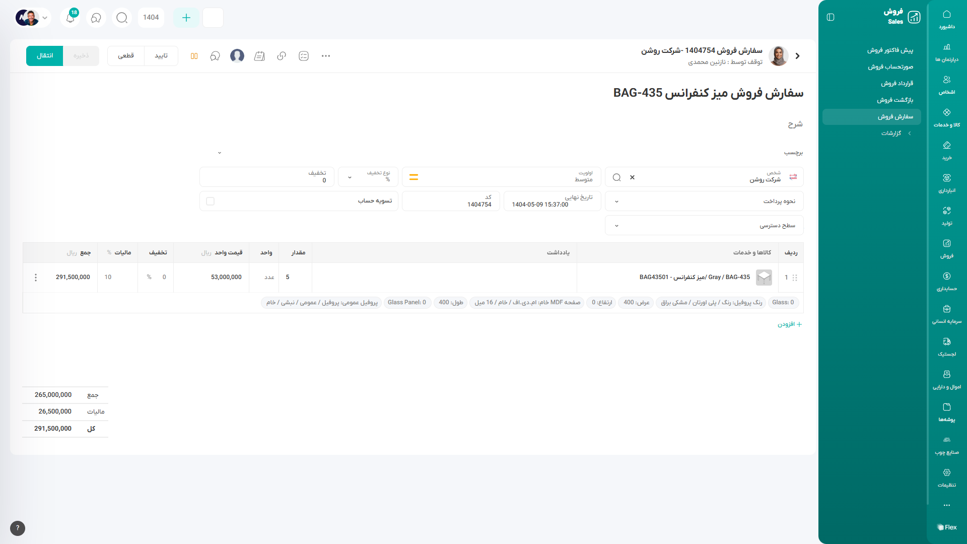 پس از تایید پیشفاکتور توسط مشتری و پرداخت پیشپرداخت، سفارش فروش در سیستم ثبت میگردد. این سفارش بیانگر توافق طرفین در خصوص اقلام، تعداد، قیمت و شرایط تحویل کالا یا خدمات است. لازم به ذکر است که در این مرحله هنوز عملیات خروج کالا از انبار انجام نمیشود و تنها اطلاعات سفارش ذخیرهسازی میشود تا در مراحل بعدی مورد استفاده قرار گیرد.