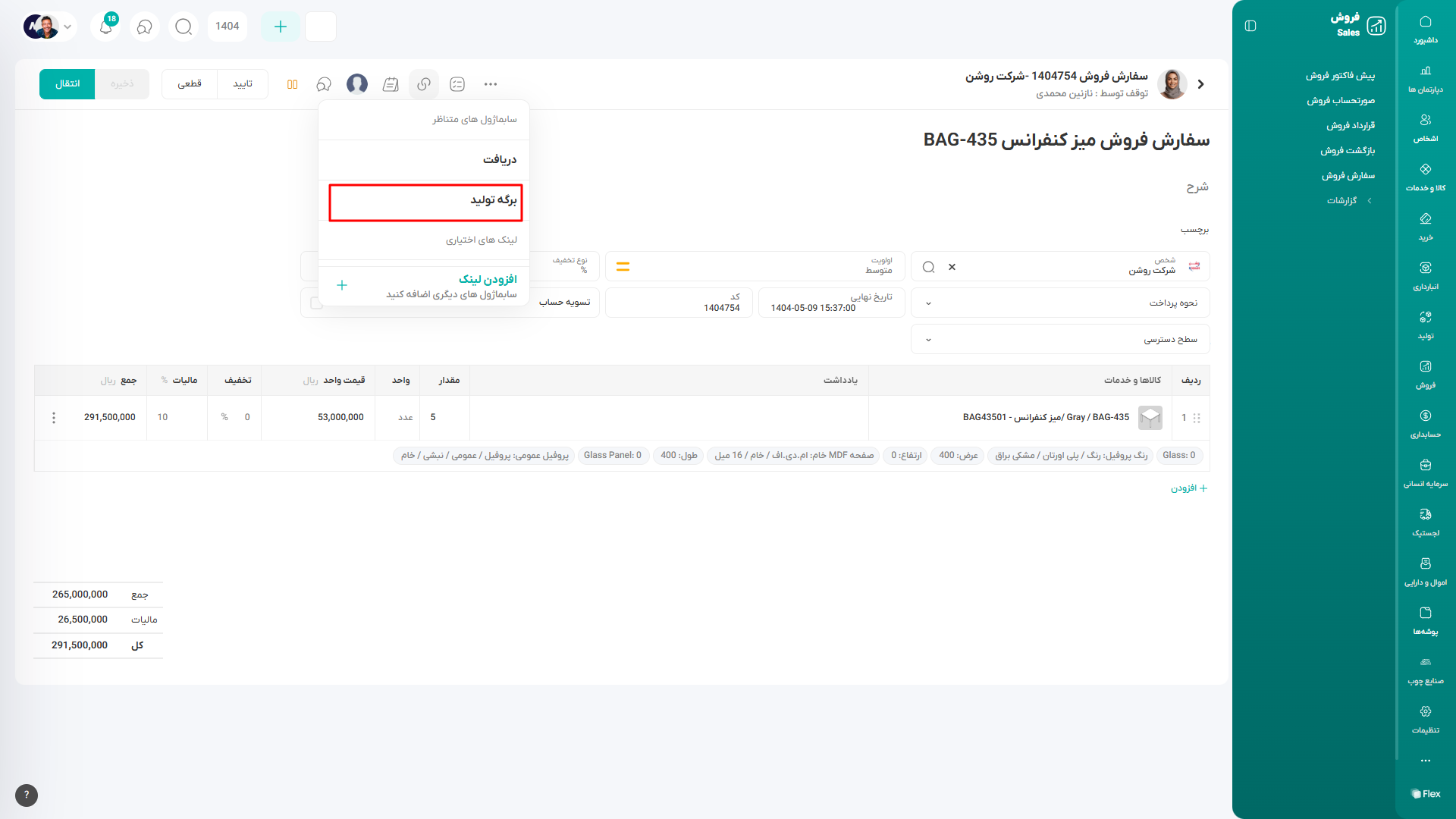 زمانی که آیتمهای سابماژول سفارش فروش وارد و تکمیل میشود و میخواهید که سفارش وارد چرخه تولید شود، روی گزینه "برگه تولید" در سابماژولهای متناظر کلیک کنید.