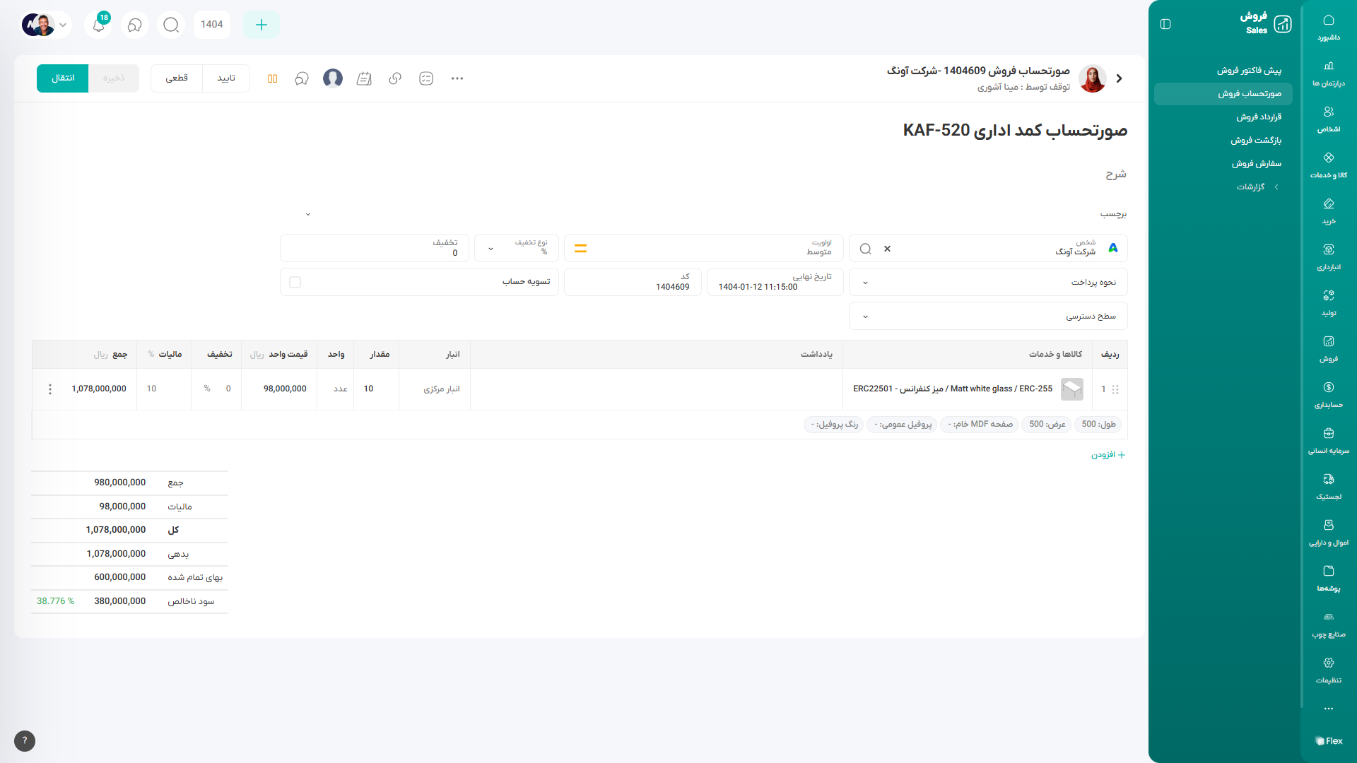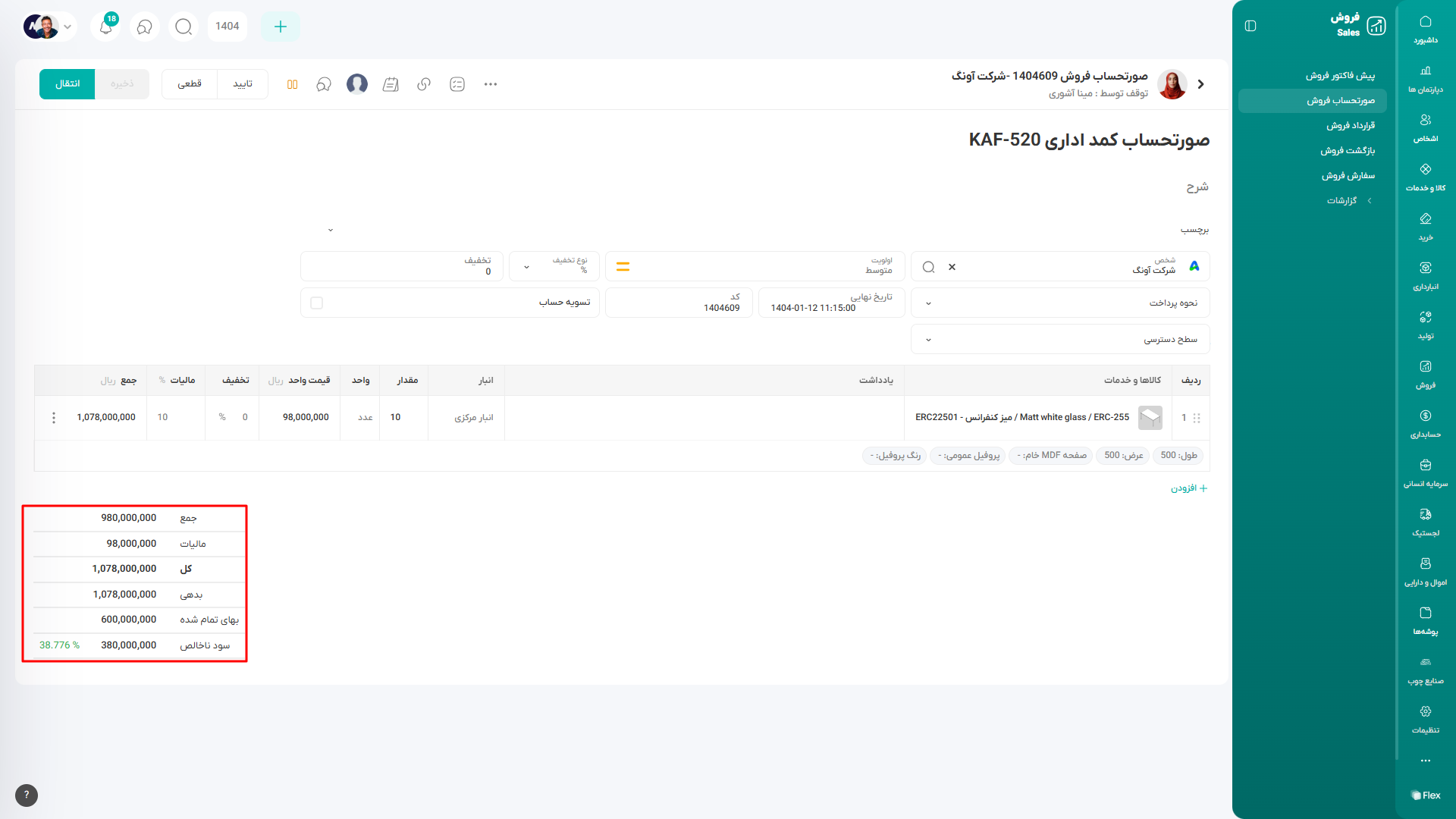 - در صورتی که در صورتحساب فروش، برگه تولیدهایی که مرتبط هستند لینک شوند، شما میتوانید بهای تمام شده برای سفارش، سود و درصد سود ناخالص خود را مشاهده و بررسی نمایید.