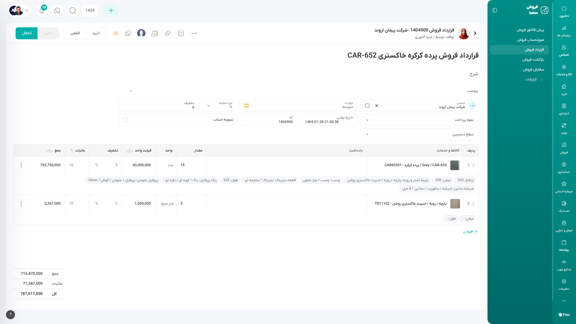 این بخش برای ثبت و مدیریت توافقنامههای رسمی میان شرکت و مشتریان منعقد شده است. قرارداد فروش، اطلاعاتی همچون شرایط پرداخت، نحوه تحویل، تعهدات طرفین و سایر ضوابط حقوقی ثبت میشود. توافق نامه ای است که بین شرکت و مشتریان منعقد شده و طی یک رویداد در سیستم ثبت میشود.
