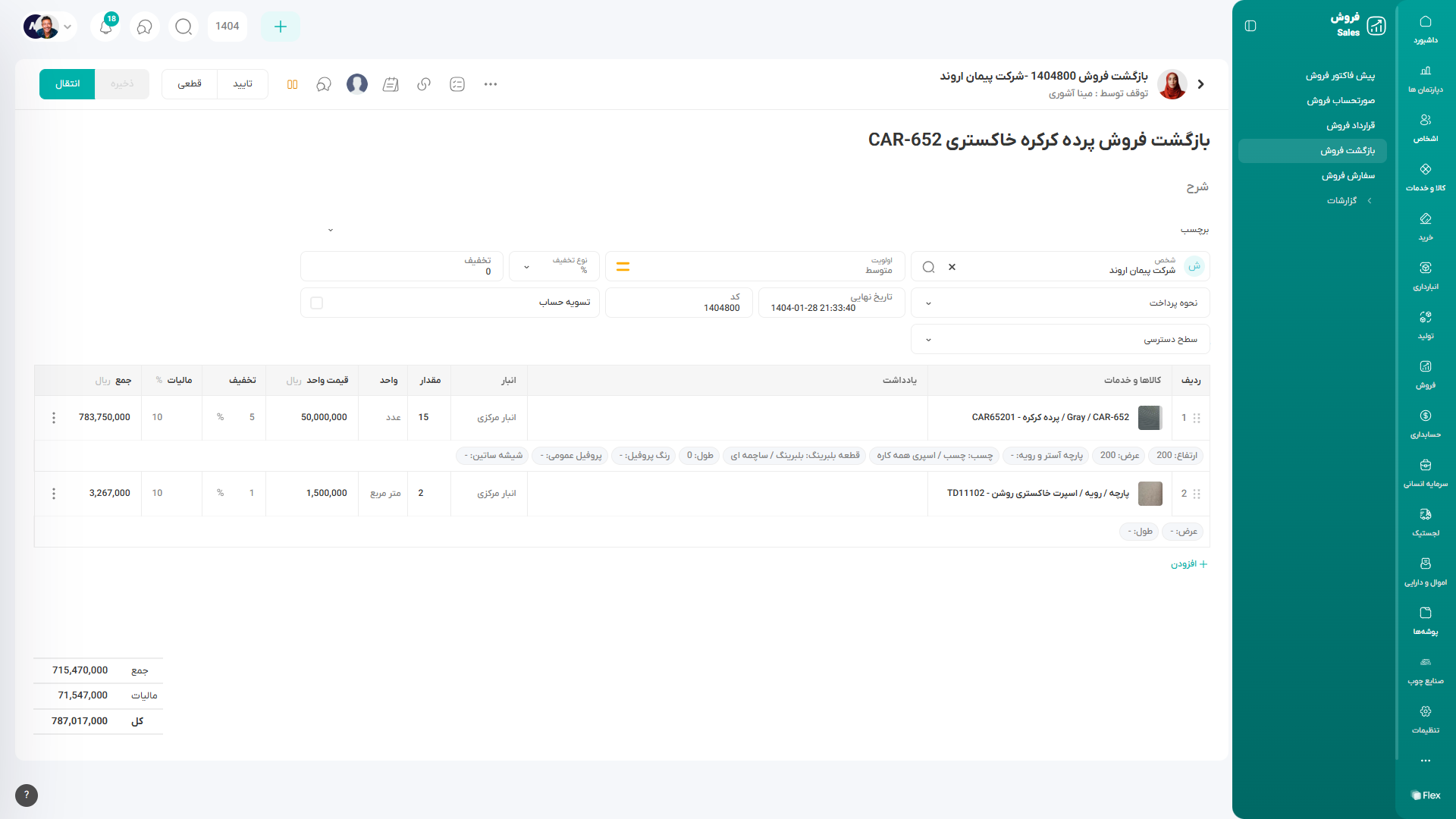 در صورتی که مشتری هریک از آیتم های یک صورتحساب فروش را بازگرداند، عملیات بازگشت از فروش از طریق این سابماژول انجام میشود. ثبت این فرآیند منجر به اصلاح موجودی انبار شده و سند مالی مرتبط با مرجوعی نیز بهصورت خودکار در سیستم ثبت میگردد.