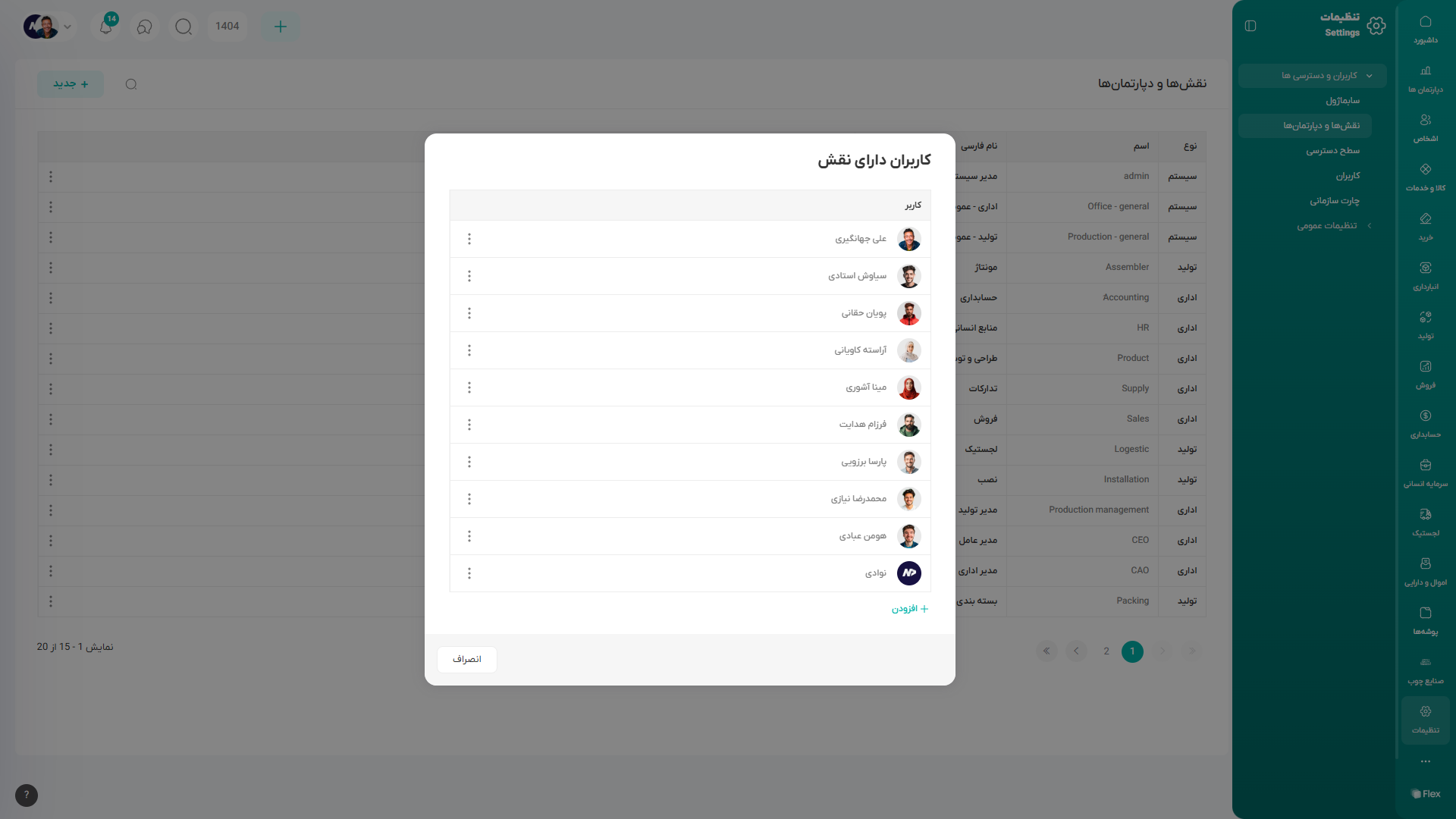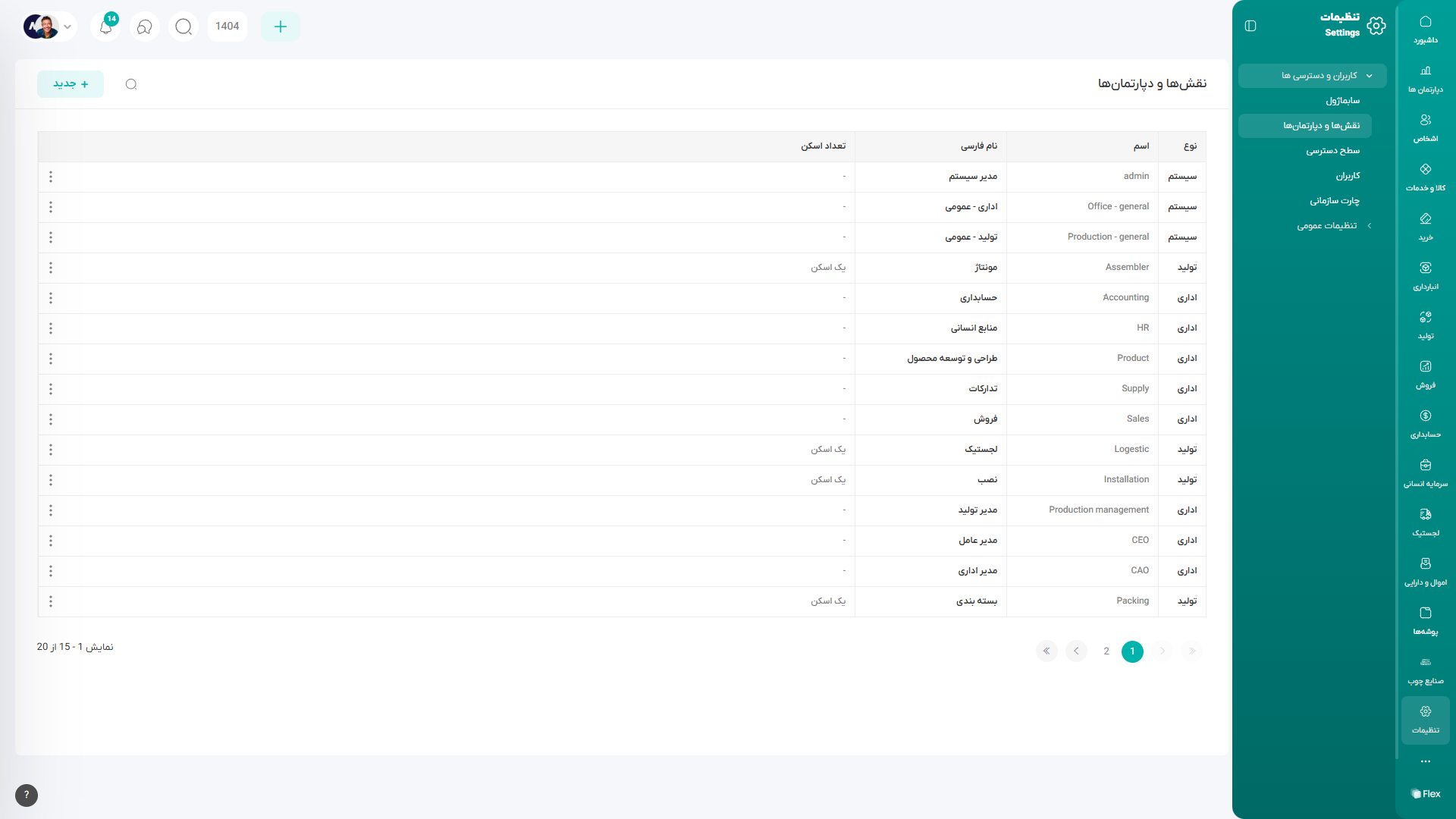 نقشهای سیستمی: این نقشها مختص ادمینها و مدیران سیستم هستند که دسترسی کامل به تمامی بخشها و تنظیمات نرمافزار دارند و میتوانند نظارت کلی بر فرآیندها، دادهها و کاربران سیستم داشته باشند.