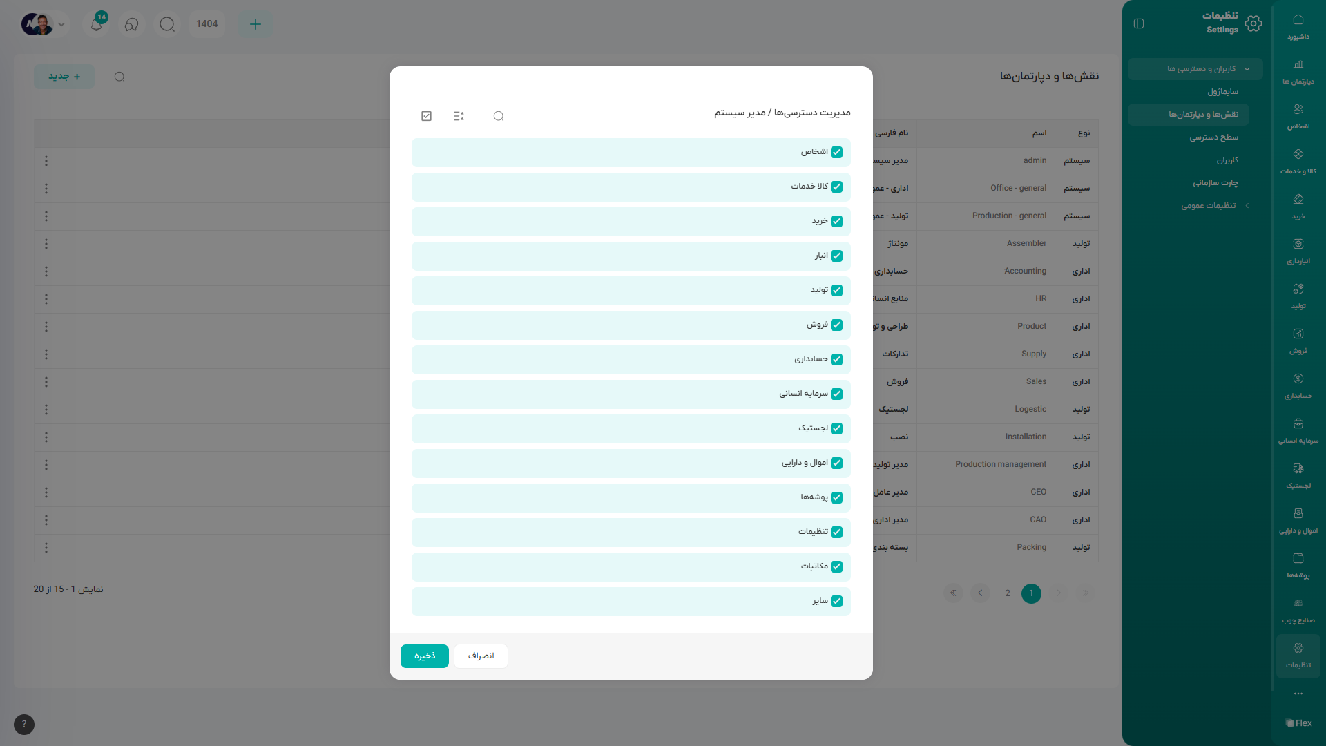 این پنجره بر اساس ماژولهای فلکس دستهبندی شده شما میتوانید پس از ایجاد نقش، وارد بخش مدیریت دسترسیها شوید و مجوزها را بر اساس شرح وظایف آن نقش تخصیص دهیددر این پنجره امکان انتخاب همه یا لغو انتخاب همه فراهم است و با کلیک روی هر ماژول میتوانید زیر نقشهای مربوط به آن را مشاهده و انتخاب کنید. علاوه بر این، با استفاده از آیکون جستجو میتوانید نقش یا زیر نقش موردنظر خود را جستجو نمایید.