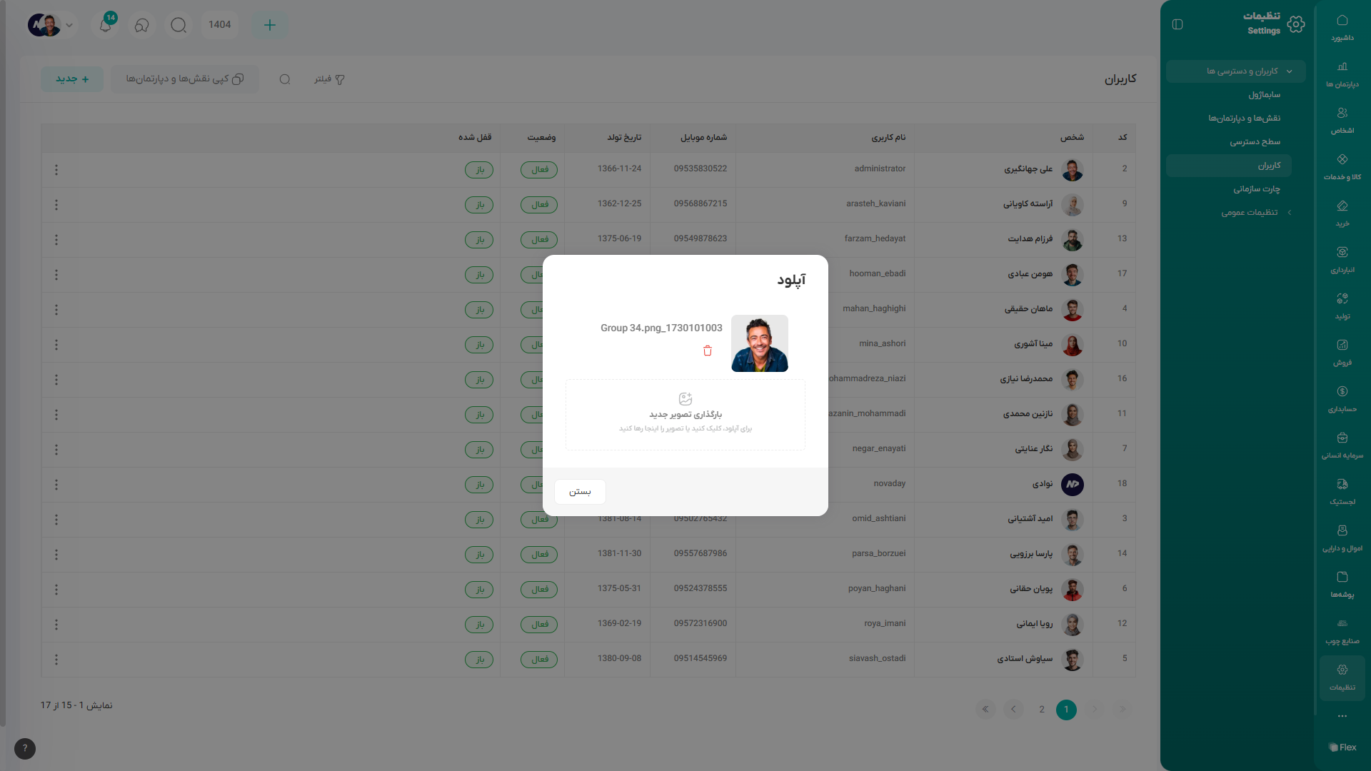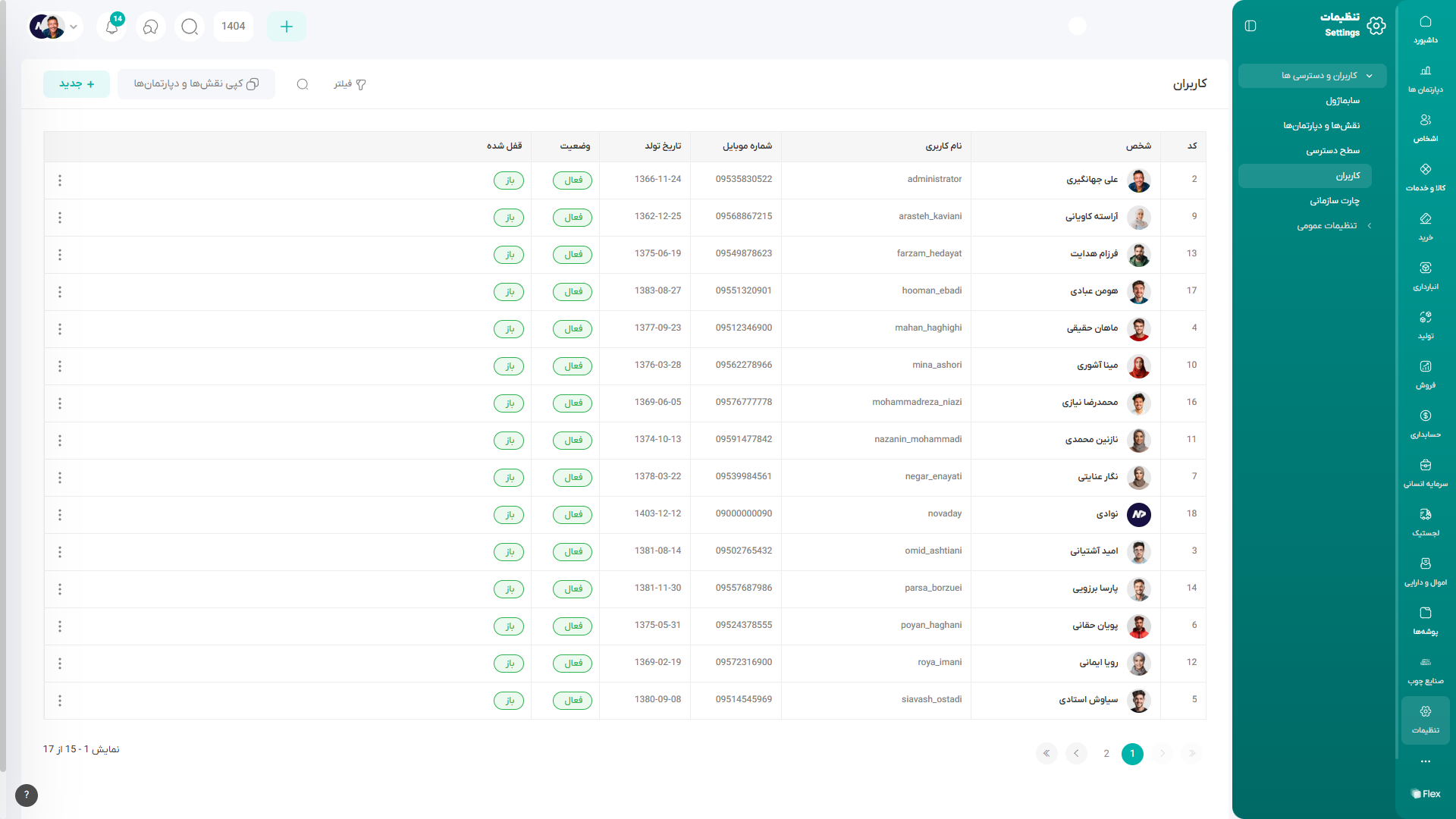 در این صفحه، لیست کامل کاربران سیستم نمایش داده میشود. این بخش امکان مدیریت کاربران را به راحتی در اختیار مدیر سیستم قرار میدهد. اطلاعات نمایش دادهشده برای هر کاربر شامل موارد زیر است: