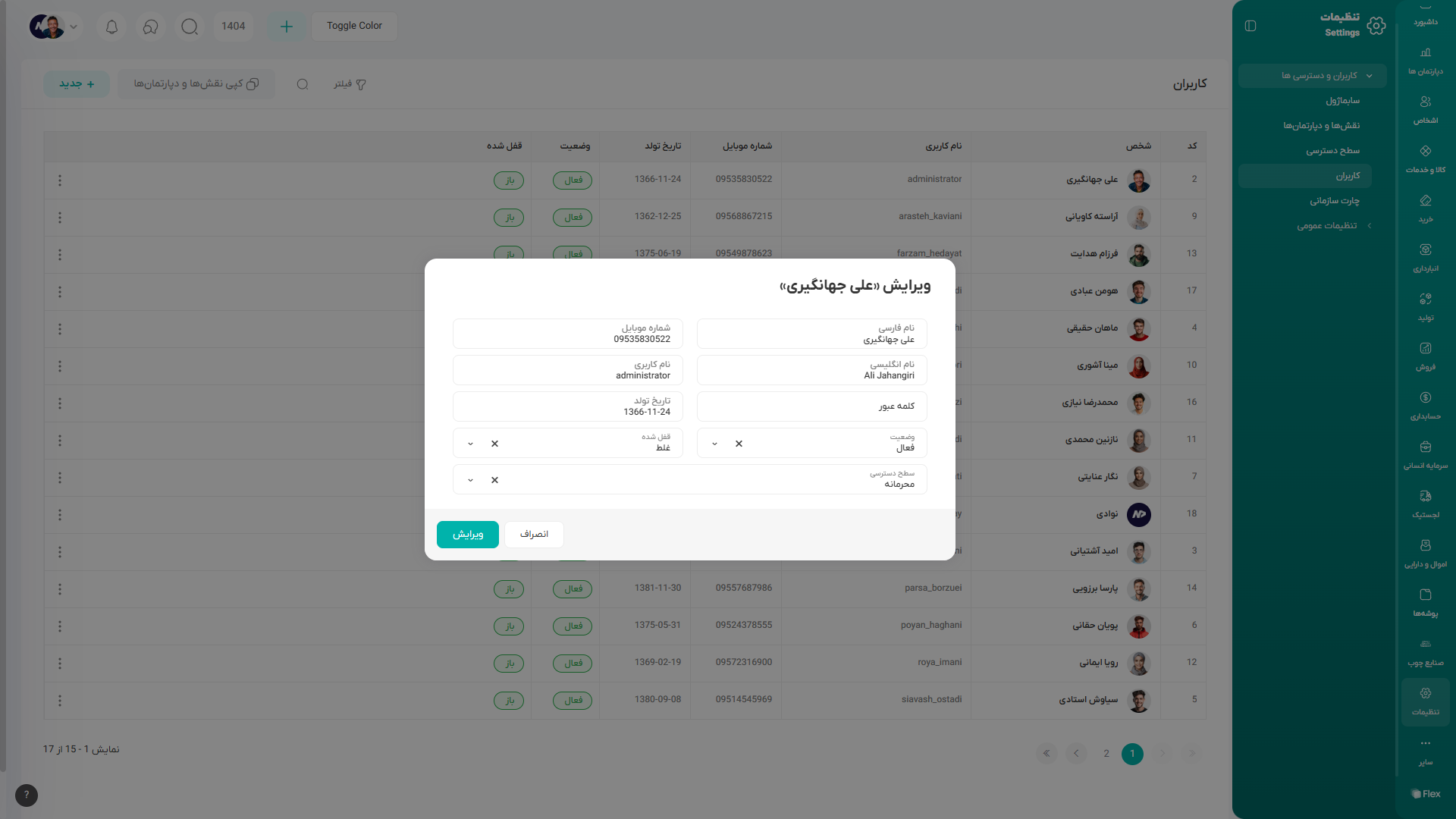 در این بخش، با کلیک بر روی آیکن ویرایش که در کنار نام هر کاربر قرار دارد، یک مودال برای ویرایش اطلاعات کاربر باز میشود. در این مودال، شما میتوانید اطلاعات مختلف کاربر را مشاهده و تغییر دهید. این اطلاعات شامل موارد زیر است:
