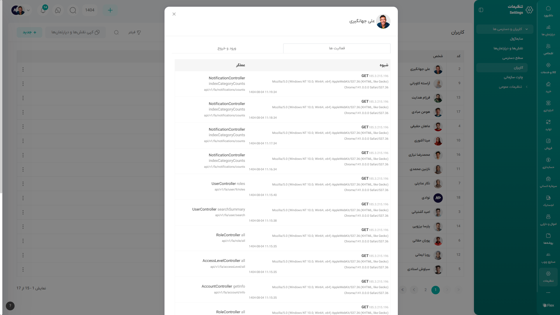 فعالیت ها : در بخش فعالیتها، تمامی عملیاتهای انجامشده توسط کاربر در سیستم نمایش داده میشود. این اطلاعات شامل جزئیاتی مانند تاریخ و ساعت هر فعالیت، نحوه انجام عملیات و مسیر درخواستشده میباشد. این اطلاعات به مدیران سیستم کمک میکند تا روند فعالیتهای کاربر را پیگیری کنند و در صورت نیاز، مشکلات را شناسایی و رفع کنند.