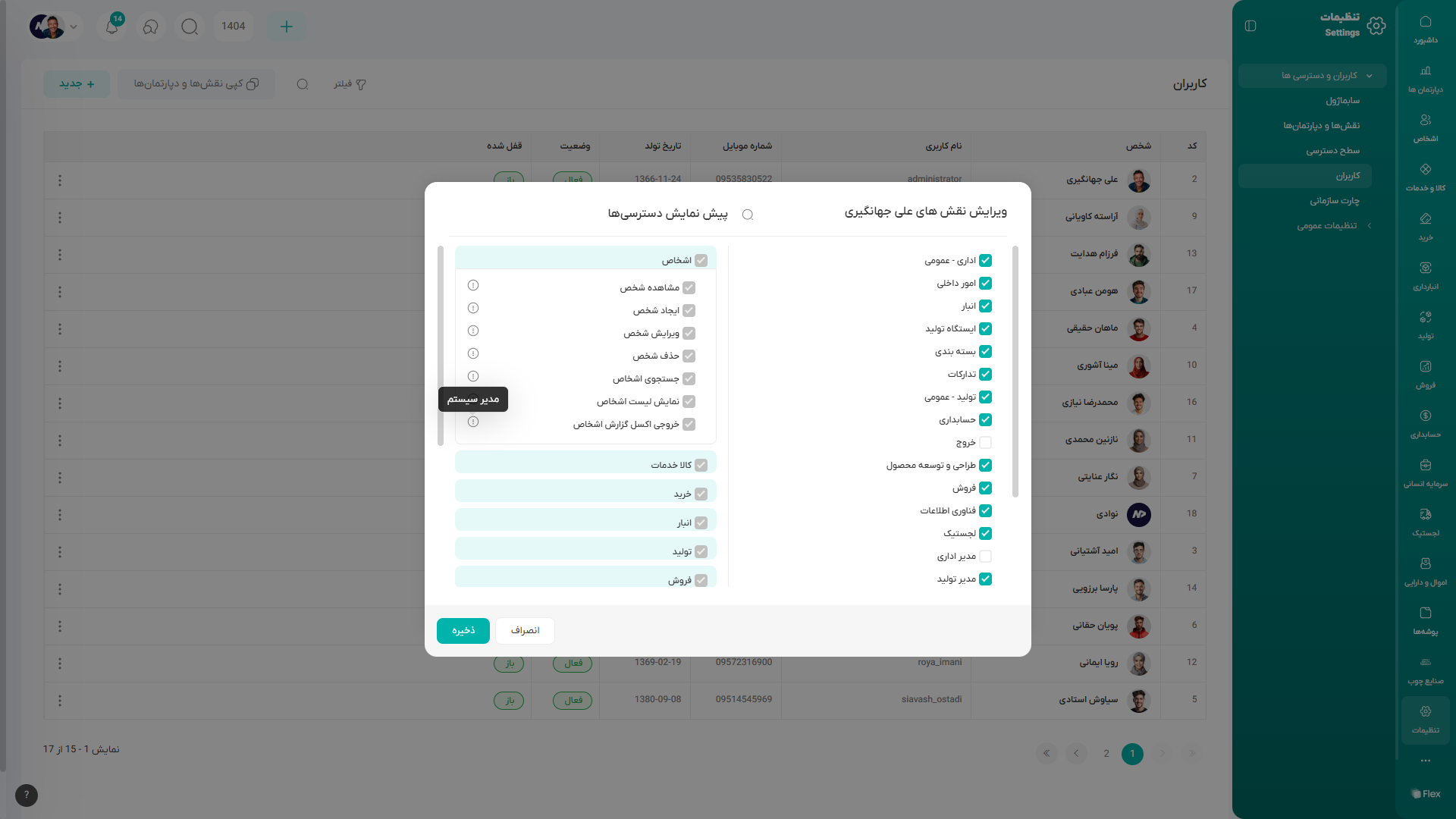 با کلیک بر روی مدیریت نقشها و دپارتمانها،ویرایش نقشهای کاربر باز میشود. در این بخش، لیستی از نقشهای مختلف موجود در سیستم نمایش داده میشود. مدیر سیستم میتواند با فعال یا غیرفعال کردن تیک مربوط به هر نقش، دسترسی مشخصی را به کاربر اختصاص داده یا حذف کند.