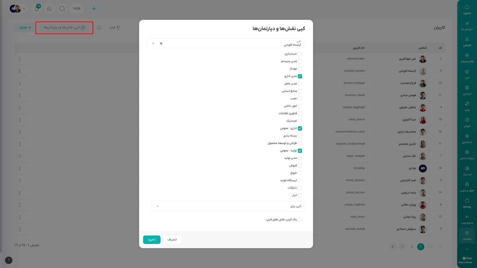 در صورتی که قصد دارید نقشهای یک کاربر را به کاربر دیگر اختصاص دهید، میتوانید از گزینهی “کپی دسترسی” استفاده نمایید. این بخش برای اختصاص دادن نقشها و سطح دسترسی یک کاربر به کاربر دیگر استفاده میشود.